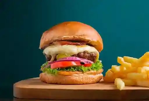 Hamburguesa de 150 gr con carne de res, queso manchego y 200 gr de papas a la francesa.